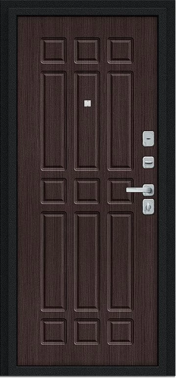 Надежная входная Дверь Браво Мило МФ/BChrome Букле черное/Букле черное/Wenge Melinga премиум класса по цене 33 115 руб. Большая толщина стали защитит от проникновения в ваш дом, квартиру или коттедж. Используется очень качественная фурнитура: замки, цилиндры, ручки, защелки. Покрытие и отделка двери изготовлено под внимательным контролем производителя. Дверь имеет долгий срок службы и гарантию.